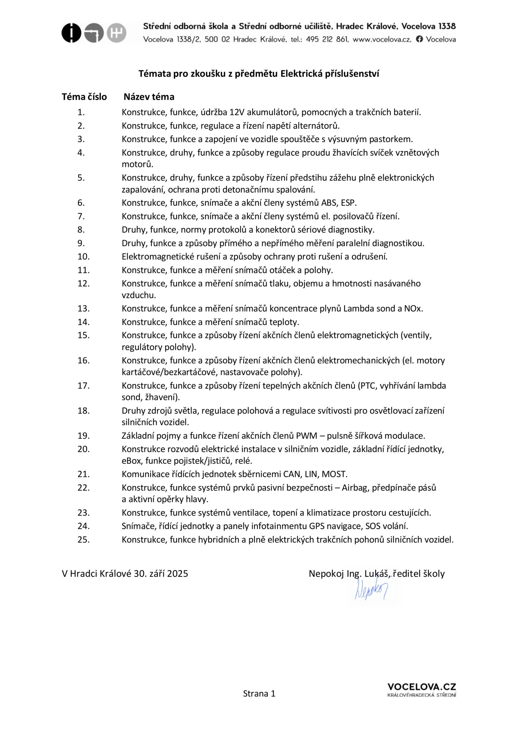 Úvod Maturitní zkoušky Struktura a témata maturitních zkoušek Autotronik Elektrické příslušenství