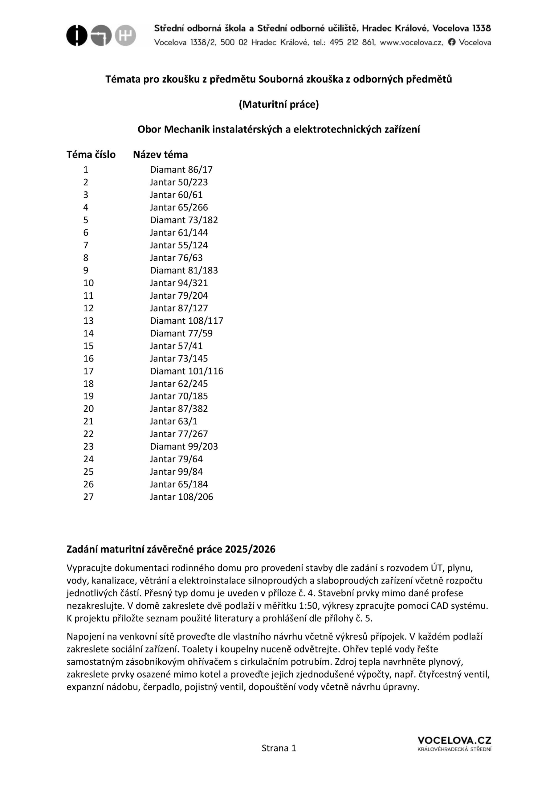 Úvod Maturitní zkoušky Struktura a témata maturitních zkoušek Mechanik instalatérských a elektrotechnických zařízení Souborná zkouška z odborných předmětů (Maturitní práce)